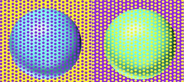 على وجه الخصوص، تظهر الكرة اليسرى باللون الأزرق أو الأرجواني لأن الخلفية المحيطة بها صفراء مع نقاط أرجوانية. تعمل هذه الألوان على تعزيز إدراك الظلال الباردة للكرة.